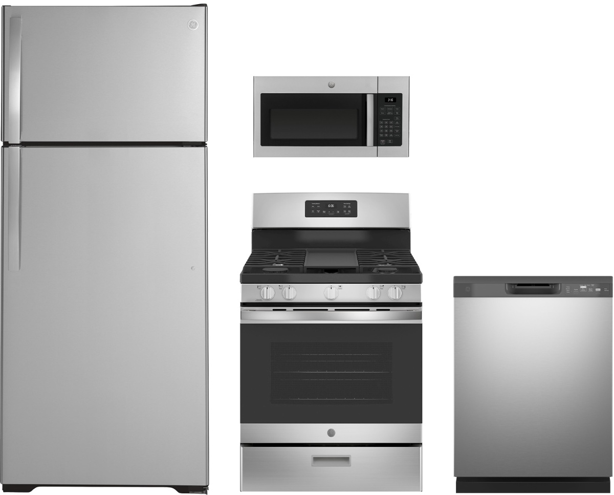 GE® 4 Piece Stainless Steel Kitchen Package with top freezer refrigerator, built in dishwasher, freestanding gas range and over the range microwave.Read More